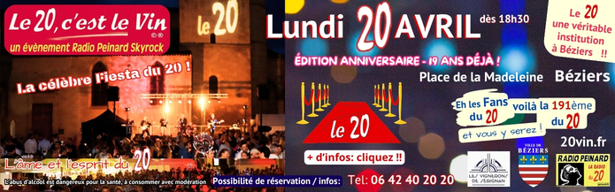 | "LE 20, C'EST LE VIN" Invitation 2 pers. VIP Tapas/Vin Vendredi 20 MARS dès 19h Place de la Madeleine / Béziers5 X 2 pers.Tirage au sort le 17 Mars