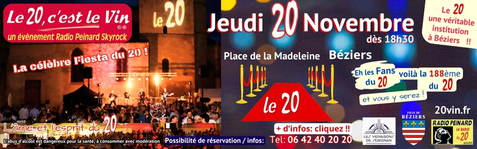| "LE 20, C'EST LE VIN" Invitation 2 pers. VIP Tapas/Vin Lundi 20 Octobre dès 18h30 Place de la Madeleine / Béziers3 gagnant(e)s VIP 2 pers.Tirage au sort le 17 Octobre